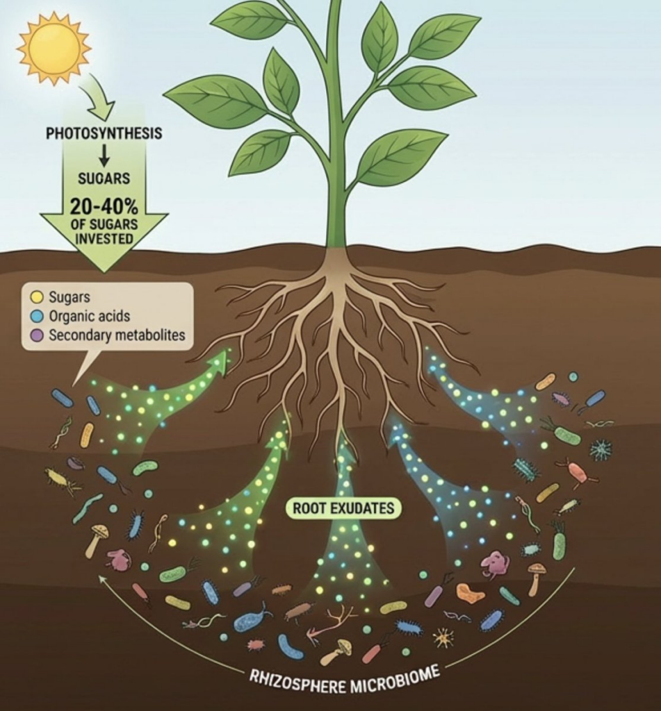 Cet important investissement énergétique est rentabilisé par le recrutement de micro-organismes bénéfiques dans le sol, qui fournissent des nutriments et protègent contre les agents pathogènes, des services que la plante ne peut pas assurer elle-même.